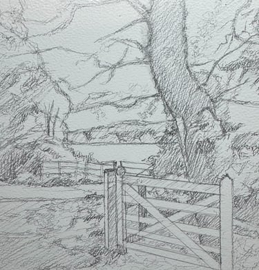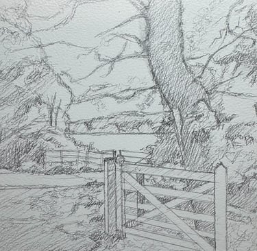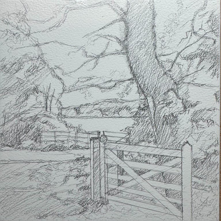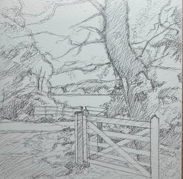 Ian's oil paintings often begin with a loose, freehand pencil sketch, used to establish the composition in relation to the panel and provide a clear sense of direction. Once the sketch is complete, an imprimatura is applied in a single tone of Burnt Sienna, gently setting out the initial shadows and highlights. When the overall tonal balance feels right, he moves into the block-in stage, laying down the key shapes and colours in a simplified form to establish the first impression of the image.